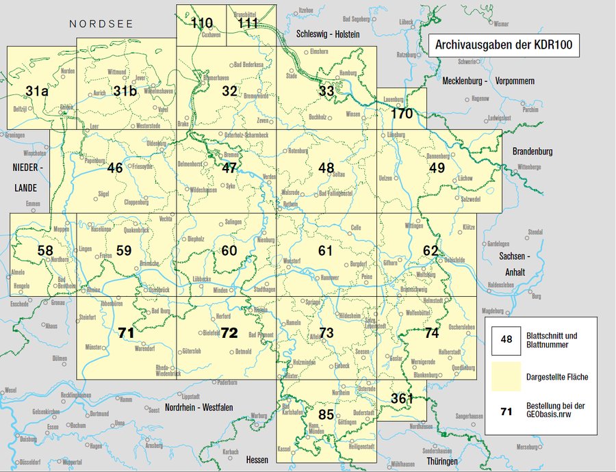 In 22 Großblätter und 4 Kleinblätter gliedert sich die KDR, während das Digitale TK100-Archiv die genannten Bundesländer mit 28 Blättern abdeckt. In Summe ergeben sich für KDR100 und TK100 bis zu 14 historische Ausgaben im Maßstab