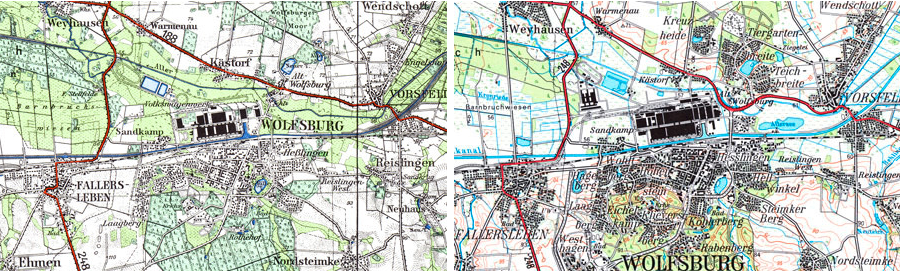Innerhalb der Kartenwerke ist für den jeweiligen Ausgabe-Zeitraum mit konstantem Maßstab und Blattschnitt ein direkter Vergleich möglich.